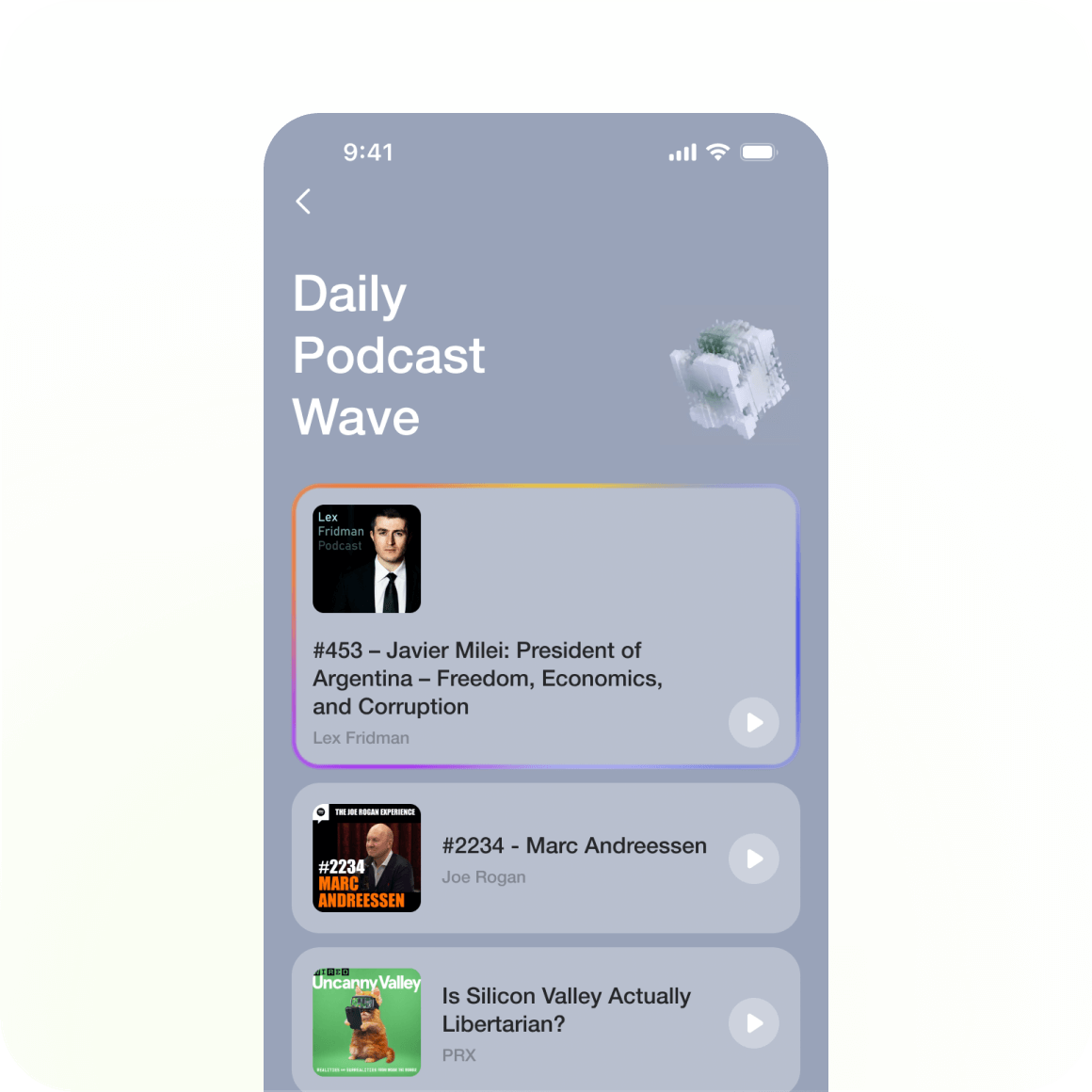 The AI agent selects podcasts based on your preferences. Hear quick highlights, then just say which one to play.