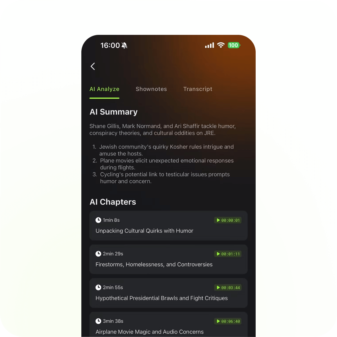 Get instant highlights and chapter info for any episode. Jump straight to what you care about — no scrolling needed.