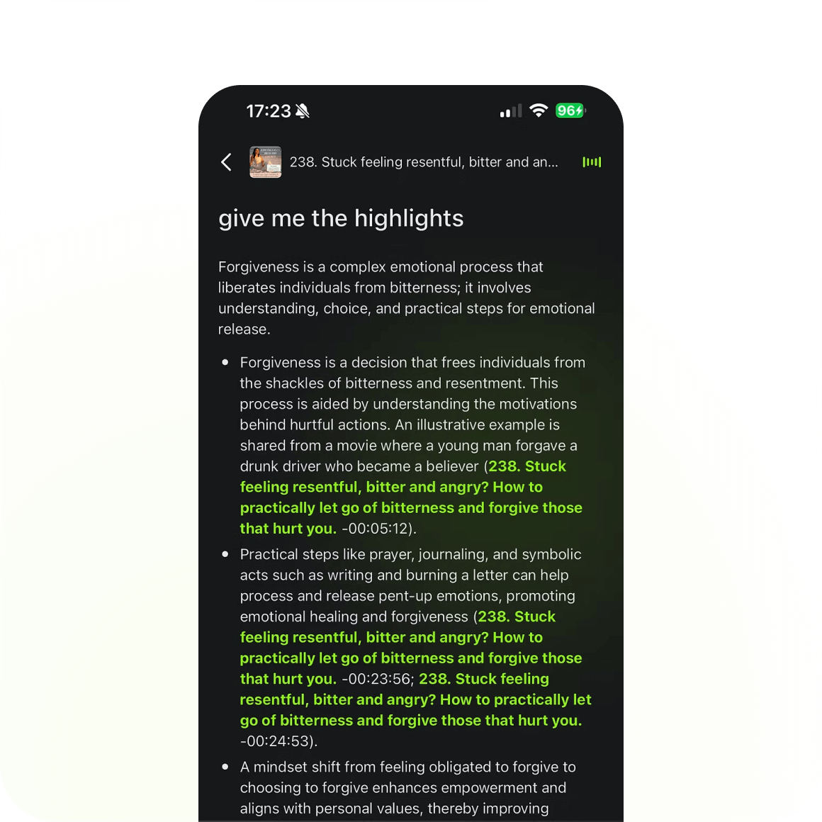 Ask questions while listening. The AI finds answers directly from the episode — no guesswork, no hallucination.